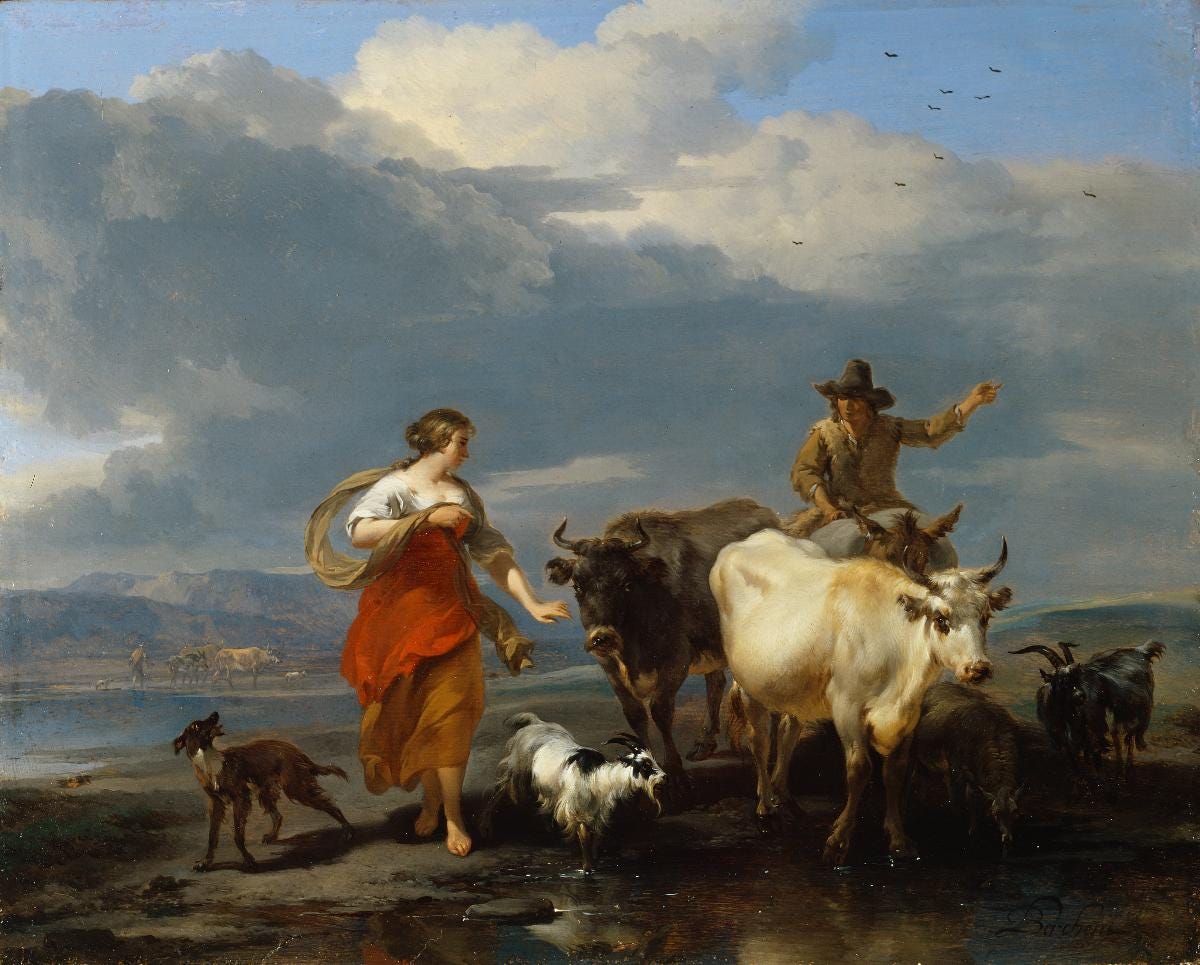 Above: Southern Landscape with Shepherdess and Mule-rider at a Ford, 1672