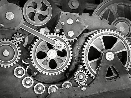 Above: Chaplin, swallowed up by factory gears in his 1936 film, Modern Times.