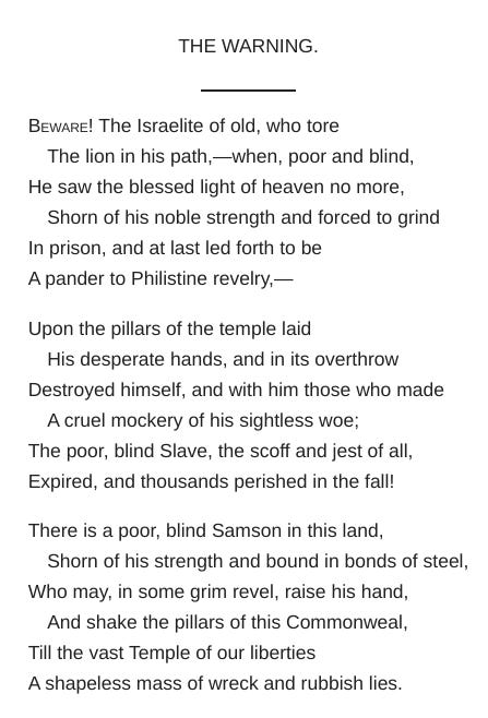 In 1842, Longfellow published Poems on Slavery, the last of which is called “The Warning”.