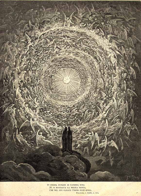 Above: Rosa Celeste. Dante and Beatrice gaze upon the highest Heaven; from Doré's illustrations to the Divine Comedy, Paradiso. Canto 28, lines 16–39