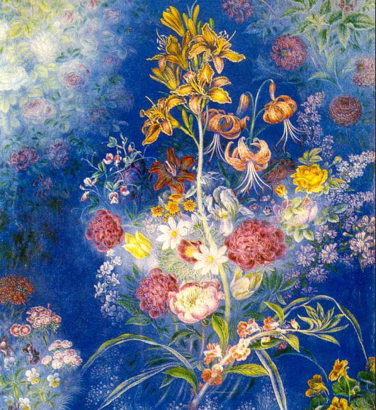 Above: Flowers on the blue background (detail), 1943